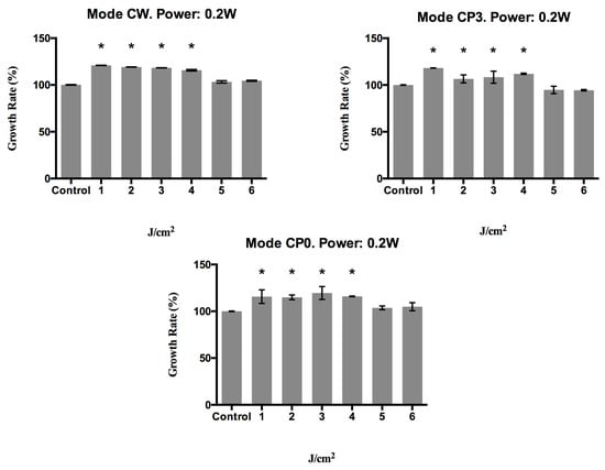 Growth rate (%) of human epithelial fibroblasts at 72 h post-irradiation with a 940 nm diode laser in different emission modes: CW, CP0, and CP3, with different energy density doses (1, 2, 3, 4, 5, and 6 J/cm2) and a power of 0.2 watts. * p < 0.05.