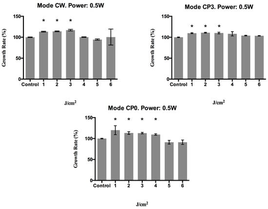 Figure 3 shows the growth of fibroblasts treated with a power of 0.5 W using the different energy transmission modes. In CW mode, the growth rate was significantly (p < 0.001) higher versus controls after treatment at 1, 2, or 3 J/cm2. In CP0 and CP3, the growth rate was also significantly (p < 0.032) higher at 4 J/cm2.