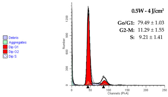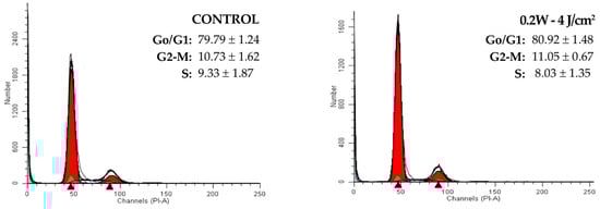 The cell cycle study of CCD-1064Sk fibroblast cell line was carried out by flow cytometry according to the procedure described by Manzano-Moreno et al. [29]. Before the treatment, we performed the starvation on cells for synchronization, for which cells were grown in medium DMEM without FBS. Briefly, fibroblasts were treated with a 940 nm diode laser in CW mode under different conditions (power of 0.2 or 0.5 W and energy density of 2, 3, or 4 J/cm2) for 24 h at 37 °C. Cells were then detached from the culture flask with a solution of 0.05% trypsin and 0.02% (w/v) (EDTA) and were washed and suspended in phosphate-buffered saline (PBS) at 2 × 104 cells/mL; 2 mL of ice-cold 70% ethanol and 30% distilled H2O were vigorously added to 200 µL of the cell suspension. Cells were left for at least 30 min in ice. At the end of this period, cells were harvested by centrifugation and resuspended in 800 µL PBS. Cells were examined microscopically and, when clumped, were passed through a 25-gauge syringe needle. Cells were then incubated at 37 °C for 30 min with 100 µL of RNase (1 mg/mL) and 100 µL propidium iodide (PI). Finally, samples were analyzed using an argon-ion laser tuned to 488 nm (Fasc Vantage Becton Dickinson, Palo Alto, CA, USA), measuring forward and orthogonal light scatter and red fluorescence and determining both the area and peak of the fluorescent signal when possible. Results were expressed as percentage of cells in each phase (G0/G1, S, and G2/M).