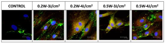 Immunostaining with fibronectin-fluorescein α-actin–phycoerythrin of human epithelial cells at 24 h post-irradiation with 940 nm diode laser under different conditions.