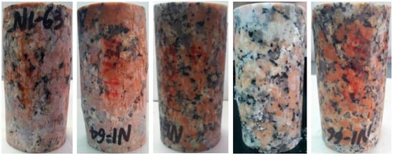 NRG01 granite samples, with an average density of 2.65 g/cm3, are pink in color and generally have coarse texture (Figure 1a,b). The granite samples have about 35% K-feldspar (grain size 2.0–22.0 mm), about 35% plagioclase (grain size 2.0–5.0 mm), about 25% quartz (grain size 2.0–4.0 mm) and about 5% other dark minerals [50]. The samples are basically intact, however, many micro-cracks with the width of about 3.0–10.0 μm can be observed in the samples based on Figure 1c–e [51].