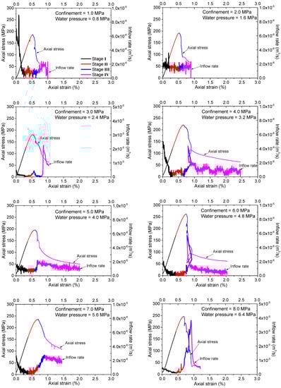 The changing inflow rate curve is plotted comparing with the axial stress–strain curve for each of the tests (Figure 8). It should be noted that different samples show quite different initial inflow rates, which are resulted from the scattered distributions of the pre-existing micro-cracks in the unsaturated samples. It is believed that this difference can be ignored, as only the evolutionary characteristics of the inflow rates are of interest in this study. Generally speaking, each of the inflow rate curves can be divided into four stages with the increasing loading and the evolution of damage and fracturing. Nonetheless, different seepage behaviors can be observed according to the comparison of the inflow rate curves under different confinements and water pressures.