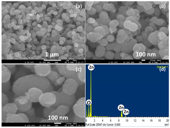 (a) Low magnification; and (b,c) high magnification FESEM images; and (d) EDS spectrum of ZnO nanoballs.