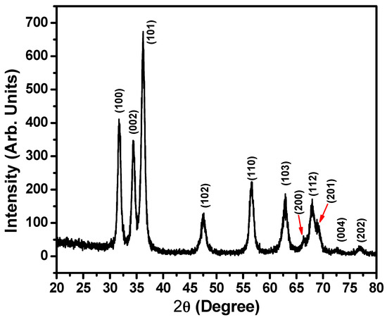 The crystallinity, crystalline size and microstructural phases for the ZnO nanoballs can be evaluated from the X-ray diffraction (XRD) spectrum as shown in Figure 2. Well-defined diffractions peaks corresponding to the diffraction planes (100), (002), (101), (102), (110), (103), (200), (112), (201), (004) and (202) at diffraction angles 31.78°, 34.43°, 36.23°, 47.63°, 56.61°, 62.91°, 66.40°, 67.95°, 69.14°, 72.59° and 76.71°, respectively, indicate the Wurtzite hexagonal phase for ZnO nanoballs. The results are supported by the JCPDS data card Nos. 36–1451 and reported literature [37,38,39,40,41,42]. No additional peak in the XRD spectrum related to any impurity, further confirms the results of EDS studies (Figure 1d).
