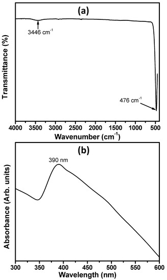 Figure 3a represents the typical Fourier transform infrared (FTIR) spectrum of hydrothermally synthesized ZnO nanoballs. A sharp and well-defined peak at 476 cm−1 is the characteristic peak for metal-oxygen (M–O) bond and confirms the formation of the Zn–O bond. Another broad band at 3446 cm−1 is due to the O–H stretching vibrational modes of the water molecules physiosorbed on the surface of the ZnO nanoballs [16,44,45,46].