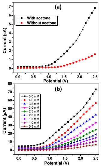 The potential electro-catalytic sensing applications of ZnO nanoballs coated onto the surface of the AgE are demonstrated in this section. Initial experimentations involves the comparison of I–V responses of the ZnO nanoballs modified AgE for 0.5 mM acetone solution prepared in the 0.1 M PBS having pH 7.4 and blank PBS within the potential range of 0.0–2.5 V. As the applied potential increases, the current response increases remarkably for the PBS containing acetone as compared to blank PBS (Figure 5a). At an applied potential of 2.5 V, the maximum current responses of 6.84221 and 1.6182 μA were observed for 0.5 mM acetone solutions and blank PBS, respectively. This substantial response of the ZnO nanoballs modified AgE towards the sensing of acetone confirms the involvement of the ZnO nanostructures in the efficient electrocatalytic activities and fast electron exchange capabilities. Figure 5b represents the effect of the acetone concentration on the current responses of the ZnO nanoballs modified AgE. Different solutions of acetone with concentration range of 0.5 mM–5.0 mM were prepared in 0.1 M PBS and were subjected to electrochemical analysis using ZnO nanoballs modified AgE as working electrode and a Pt wire as a counter electrode within the potential range of 0.0–2.5 V. It can be seen that the increase in the concentration of the acetone resulted in a marked increase in the current responses.