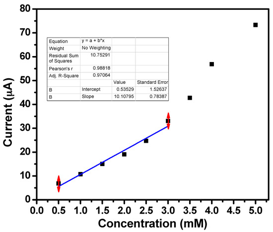 At an applied potential of 2.5 V, the current responses of 6.84221, 10.7272, 14.9831, 19.0696, 24.7101, 33.013, 42.7444, 56.8836 and 73.3094 µA were recorded for 0.5, 1.0, 1.5, 2.0, 2.5, 3.0, 3.5, 4.0 and 5.0 mM acetone solutions, respectively. Increased current responses with a concentration of the acetone can be attributed to the generation of a large number of ions and increased ionic strength of the analyte solutions [37].