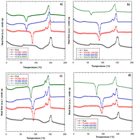 The DSC thermograms related to the first heating scan of PLA modified with the two different plasticizers are presented in Figure 2a,b, respectively for ISE and ATBC. The corresponding thermal data are listed in Table 3.