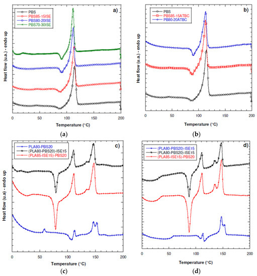 DSC thermograms (first heating scan) of PBS modified with (a) ISE and (b) ATBC at the three different weight contents of 15 wt %, 20 wt % and 30 wt %; (c) first heating scan and (d) second heating scan of PLA80–20PBS blend and ternary systems modified with ISE at 15 wt % [(PLA85–ISE15)–PBS20 and (PLA80–PBS20)–ISE15)].