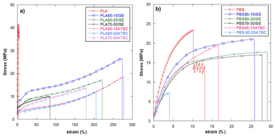 Stress–strain curves for different (a) PLA and (b) PBS films plasticized with ISE and ATBC at the three different weight contents of 15 wt %, 20 wt % and 30 wt %.