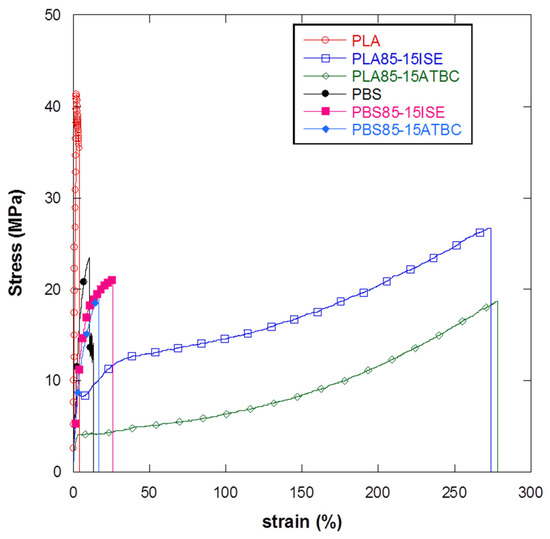 Comparison of curves from tensile tests PLA and PBS films plasticized with ISE and ATBC at 15 wt %.