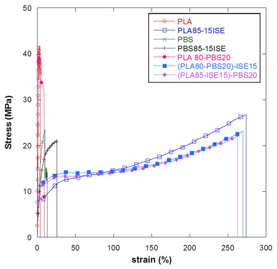 Stress–strain curves for films obtained from PLA80–20PBS and PLA–PBS blends plasticized with ISE at 15 wt %by two different mixing procedures ((PLA85–ISE15)–PBS20 and (PLA80–PBS20)–ISE15).