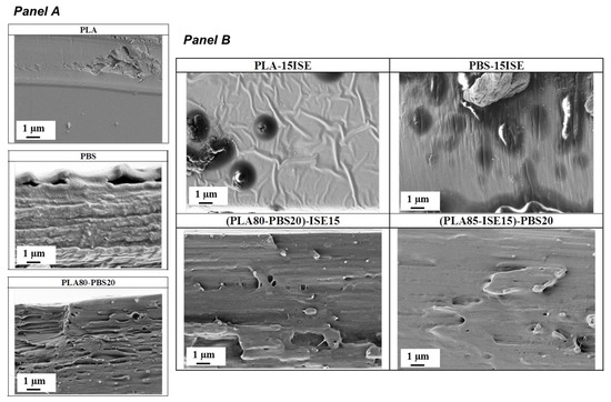 FESEM images of PLA, PBS and PLA80–PBS20 fractured surfaces (Panel A) and of PLA, PBS or PLA–PBS blends plasticized with ISE at 15 wt % by two different mixing procedures ((PLA85–ISE15)–PBS20 and (PLA80–PBS20)–ISE15) (Panel B).
