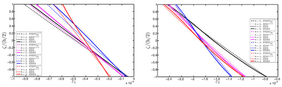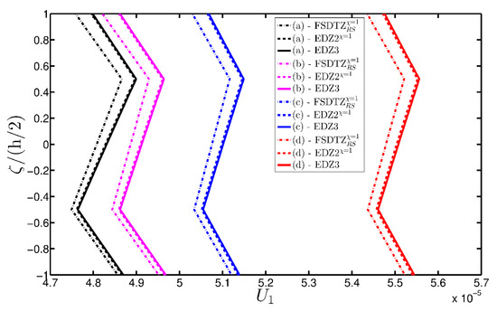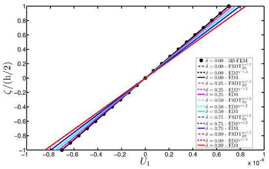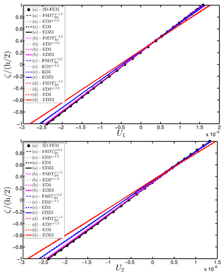 It is clear that the maximum order of expansion N defines the structural model. Consequently, the acronyms and are used to specify the theory. As illustrated in the previous papers [93,94,95], the letter “E” specifies that the theory is based on an ESL approach, whereas the letter “D” states that the governing equations are deduced in terms of the generalized displacements. The letter “Z” is added to the notation only when the Murakami’s function is embedded in the model.