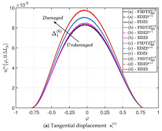 This function could be required to capture the so-called zig-zag effect that could happen when peculiar lamination schemes are considered. Further details concerning the Murakami’s function can be found in [92,93,94,129,130]. For the sake of completeness, it should be mentioned that this function allows the description of continuous three-dimensional displacements characterized by discontinuities in their derivatives at the interface between two adjacent layers. To sum up, the thickness functions are chosen as follows, for the corresponding orders of kinematic expansion