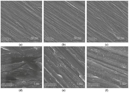 Surface morphology of (a) Control; (b) Autoclaving (AC); (c) Hydrothermal sterilization (HS); (d–f), magnified (a–c), respectively.