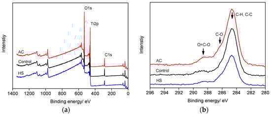 Table 1 shows the surface element ratio calculated from X-ray photoelectron spectroscopy (XPS) spectra. Ti, O, and C were the major elements on the surface of all three types of specimens. After four weeks of storage, the C ratio on the polished specimens was high. After AC, the C ratio increased significantly whereas Ti and O decreased. On the contrary, surface C was greatly reduced and Ti, O increased after HS. Figure 2a shows the XPS survey spectra of different samples. As shown, the intensity of C1s peak decreased apparently on the HS specimen. Figure 2b shows the high resolution C1s spectra of different surfaces. The peak could be decomposed into three components; those centered at 284.8 eV, 288.4 eV, and 288.1 eV were assigned to C−H/C−C, C−O, and O−C=O bonding, respectively. HS effectively removed carbon contamination with both low and high binding energy.