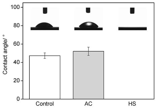 It has been demonstrated that a clean status was necessary for the good wettability of Ti substrates, and such a precondition was especially important for a surface with micro/nano-scale hybrid structures [16,19]. It is well accepted that if such structures were seriously contaminated, they would entrap air stubbornly and increase the contact angle, whereas, if they were clean, a superhydrophilicity could be obtained. UV and plasma treatments could impose superhydrophilicity to rough surfaces based on the decomposition of hydrocarbons molecules; however, the HS process seemed to achieve it by forming a nano-scaled structure and achieving decontamination simultaneously, Figure 3. Moreover, it could preserve the clean status for a much longer time, as Ti specimens were kept from recontamination by pure water after sterilization. The results in Figure 4 highlighted the combination of HS and wet storage. Although the AC specimens could obtain a superhydrophilic surface as well by immersion in water, it would take a much longer time and would hence hinder the subsequent steps of healing, as immediate interactions between the implant and the surrounding biological environment are very important.