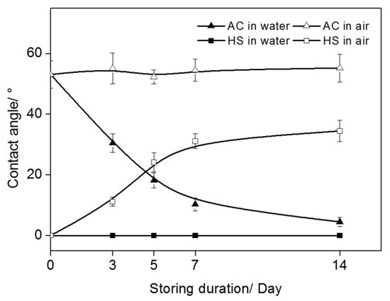 After being stored in a poly ethylene (PE) bag for four weeks, the contact angle on the polished Ti surface was 46°. After AC treatment and drying, the water contact angle increased to 53°, as shown in Figure 3. In contrast, the water drops spread out quite fully on HS specimens and the contact angle was as low as 0°. However, the effect of storage condition on time-related changes of surface wettability was obvious. As can be seen from Figure 4, the initial superhydrophilicity of HS specimens was quickly impaired in the atmosphere, whereas the specimens kept in water remained superhydrophilic after two weeks of storage. The wettability of AC specimens could be improved when kept in water; however, the process was slow as it took about two weeks for the contact angle to reduce to less than 5°.