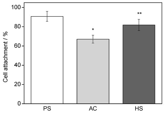 Cell attachment ratio on different specimens 3 h after seeding. * Significantly different compared with PS; ** Significantly different compared with AC.