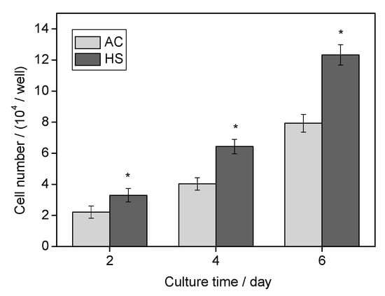 Quantified results of cell attachment on AC and HS specimens are presented in Figure 5. After 3-h cultures, HS specimens showed significantly higher (p < 0.01) cell attachment compared with autoclaved ones.