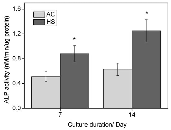 Alkaline phosphatase activities of cells on AC and HS specimens after seven and 14 days of culture. * Significantly different compared with AC.