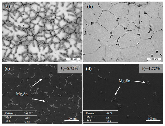 Figure 1 shows the microstructures of TZA822 alloys without and with T4 prior to extrusion. The alloy without T4 (Figure 1a) exhibited a typical dendritic microstructure, and the average secondary dendrite arm space was ~62 μm. After T4 (Figure 1b), the equiaxial grains with an average grain size of ~120 μm and a few undissolved particles distributed at the grain boundaries and grain interiors could be observed. According to the SEM and EDS results (Figure 1c,d), these undissolved particles could be identified as Mg2Sn phase. The volume fractions of these phases in both conditions were measured to be ~8.73% and ~1.72%, respectively. According to the Mg-Sn binary phase diagram, since the Mg2Sn phase has a melting point of 770 °C and the equilibrium solid solubility of Sn in Mg at 450 °C is approximately 7.28 wt %, few Mg2Sn phases should remain in the alloy after solution treatment. These differences in the volume fraction of Mg2Sn particles resulted in various extrusion morphologies, as well as related tensile properties, which will be discussed in the following sections.