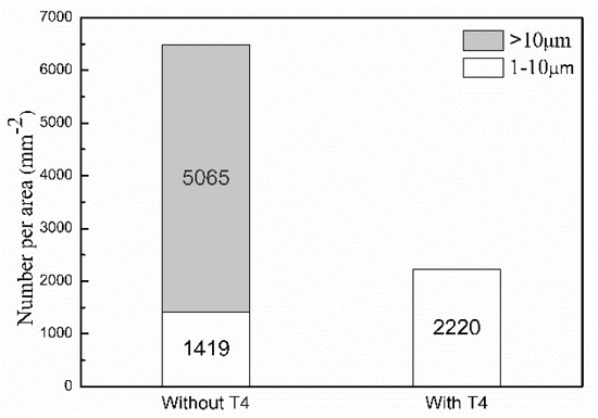 The size distribution and number per area of Mg2Sn particles larger than 1 μm in the extruded TZA822 alloys are shown in Figure 3. As indicated, the number per area of particles ranging from 1 to 10 μm in size of the extruded alloy with T4 was larger than for their counterpart without T4. It is known that particles having 1~10 μm diameter can act as nucleation sites for DRX during hot deformation, because of the higher dislocation density and large orientation gradient induced at the deformed zones in the vicinity of the particles [19]. This phenomenon is known as particle stimulated nucleation (PSN), and has been widely observed in wrought Mg alloys [20,21]. For this reason, a larger amount of the 1~10 μm sized particles led to a higher fraction of DRXed grains in the extruded alloy with T4.