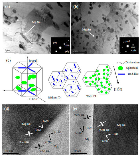 Utilization of the high-resolution TEM (HR-TEM) images obtained from the Mg2Sn phases in Figure 4a,b, and the correlative results are shown in Figure 4d,e. It can be concluded that Mg2Sn phases have crystalline orientation relationships with the Mg matrix in both alloys, namely: (20)Mg∥(220)Mg2Sn for the extruded alloy without T4; and (20)Mg∥(220)Mg2Sn for the extruded alloy with T4. Similar results on the orientation relationship information of fine Mg2Sn precipitates with the Mg matrix during extrusion have been reported in extruded Mg-Sn alloy systems [13,25].