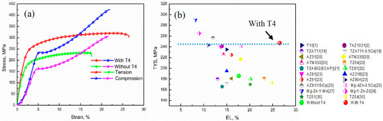 (a) Tensile and compressive stress-strain curves of the extruded TZA822 alloys; (b) TYS and EL of various Mg based wrought alloys.