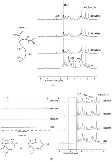 1H-NMR spectra of (a) High-Molecular-Weight Gelatin-MA (HGM) and (b) High-Molecular-Weight Gelatin-IA (HGI) crosslinkers.