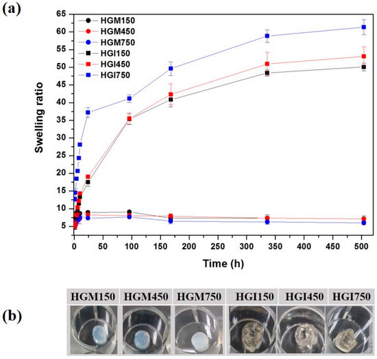 Swelling ratio (a) and photographs (b) of 9 w/v % of HGM and HGI hydrogels.