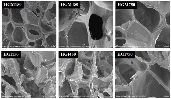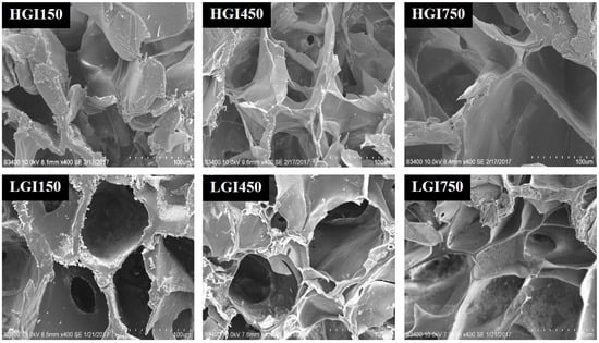 In addition, the effect of various compositions of HGI and LGI hydrogels on their microstructures and swelling behaviors were studied, as shown in Figure 7. It was found that the microstructure of LGI hydrogels is similar to the microstructure of HGI and HGM hydrogels [13,18].