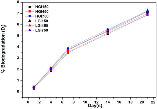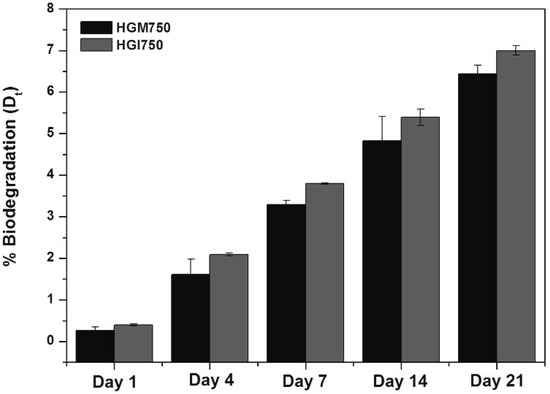 In this work, the percentage of biodegradation (Dt) of HGI750 (which had the highest swelling ratio) and HGM750 (which had the lowest swelling ratio) hydrogels was measured by the continuous biochemical oxygen demand (BOD) test, as shown in Figure 4. The results show that the biodegradation of HGM750 hydrogel was slightly slower than that of the HGI750 hydrogel. This indicates that a higher swelling ratio and porosity increased water absorption, which may be responsible for the increase in the degradation of the samples [19]. However, the difference was not as large as we expected considering the dramatic difference in their swelling ratios. We believe that this could be due to the setup of the biodegradation test. In this experiment, biodegradation was measured by the oxygen consumption of microorganisms, and the water absorption might not affect this degradation rate since the gelatin is extremely biodegradable by microbial enzymes.