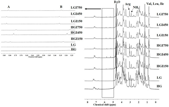 Figure 5 shows the 1H-NMR spectra of high- and low-molecular-weight gelatin, HGI and LGI. Signals appeared in the spectra of the gelatin derivatives at 5.2 ppm ≤ δ ≤ 6.0 ppm, which confirms the conjugation of gelatin with IA, as discussed previously.