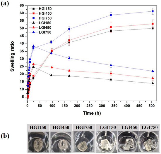 Swelling ratios (a) and photographs (b) of 9 w/v % HGI and LGI hydrogels.