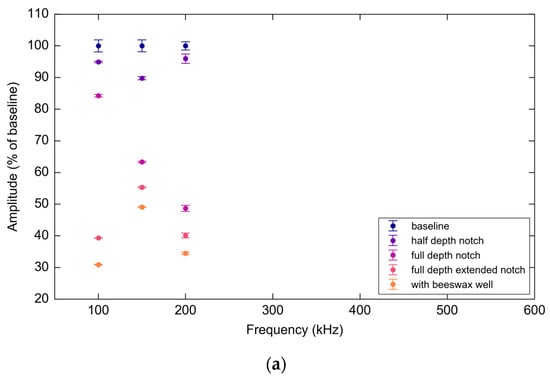 The pulse-echo data presented a more complicated picture but one broadly consistent with multiple reflection sources and mode conversion. The distortion caused by the settling time of the TRS was again evident but did not impact the following analysis due to the notch being sufficiently distant from the source PWAS. From the known Lamb wave velocities in the panel, the signal peak isolated and shown in Figure 29a, is surmised to be an A0 produced by mode-conversion of the incident S0 interacting with the notch. Figure 29b shows how the signal amplitude, expressed as a percentage of the baseline signal, varies as a function of panel state and excitation frequency. Error bars represent two standard deviations while some frequencies were omitted due to inconclusive data. In the last stage of the experiment shown in Figure 29b, the amplitude is observed to decline in response to the application of the beeswax around the source PWAS, as was expected.