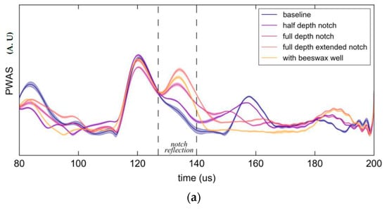 Two 5 mm diameter 1 mm thick PWAS discs were bonded to the external (clean) face of the wing skin coupon using silver loaded epoxy at an oblique orientation to the notch location as shown in Figure 32a. The attachment locations were determined from a previous acoustic wave-field survey using laser scanning vibrometry [17]. The pitch-catch response was measured across the frequency range 1 MHz–1.5 MHz in 50 kHz steps using a 5 cycle Hanning windowed tone-burst excitation signal. Synchronous averaging was not applied, so all time traces correspond to a single excitation pulse.