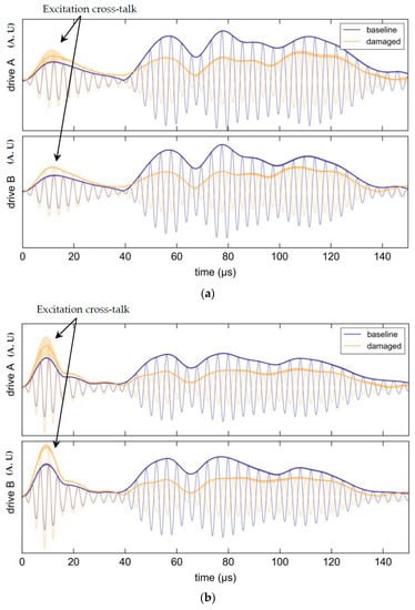 The attenuation in the first wave-packet caused by the notch was both strong and relatively consistent across the selected band, confirming that the chosen interrogation regime offers a potentially good basis for inspecting this particular structure. The variation in cross-talk amplitude is a result of variation in placement of the unshielded twisted pair PWAS connections and has no bearing on the acoustic signal.