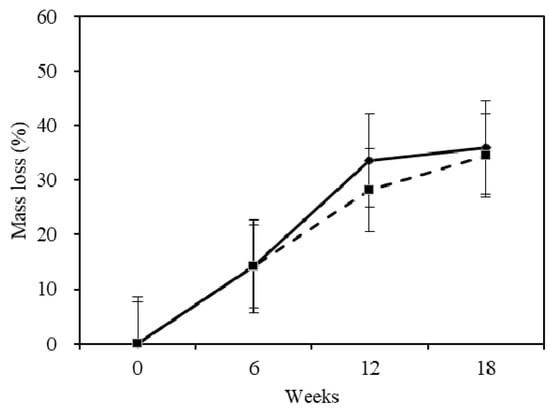 As is observed in Figure 4d, both samples showed a steady increase in the acid-insoluble lignin mass fraction during the 18 weeks. Judging from the changes, the white-rot fungus can change the acid-insoluble lignin mass fraction in the sapwood and heartwood. The acid-insoluble lignin mass fraction of sapwood and heartwood increased 5.9% and 5.7% during the whole cultivation period, respectively. Even though the acid-insoluble lignin mass fraction of sapwood and heartwood increased during the degradation time, there was still a decline of lignin mass, as shown in Table 2. The mass loss analysis and the decline of mechanical properties also demonstrated the decline of lignin. Lignin in wood supplies a physical obstacle to enzymatic disintegration of cellulose and hemicellulose [23]. However, the holocellulose of both the sapwood and heartwood underwent obvious declines, as shown in Table 1, indicating a poor ability of the lignin to prevent the white-rot fungus from degrading the holocellulose. When comparing the acid-insoluble lignin percentage loss between the sapwood and heartwood, it was found that the white-rot fungus had a strong ability to degrade the sapwood’s lignin and the degradation speed of sapwood was higher than heartwood.