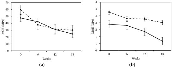 Changes of (a) modulus of rupture (MOR) and (b) modulus of elongation (MOE) before and after degradation. The continuous and discontinuous lines in the figure caption indicates sapwood and heartwood. The error bar is according to a confidence interval of 95%.