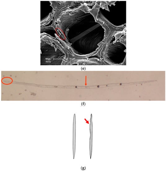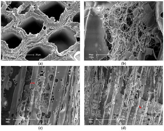 After the wood was degraded by white-rot fungus, the tracheid form of wood changed correspondingly (Figure 3f,g). The end and the middle parts of the tracheid became rough, as shown by the arrow marked. It decreased the connectivity of wood tracheid and resulted in the reduction of the mechanical properties.