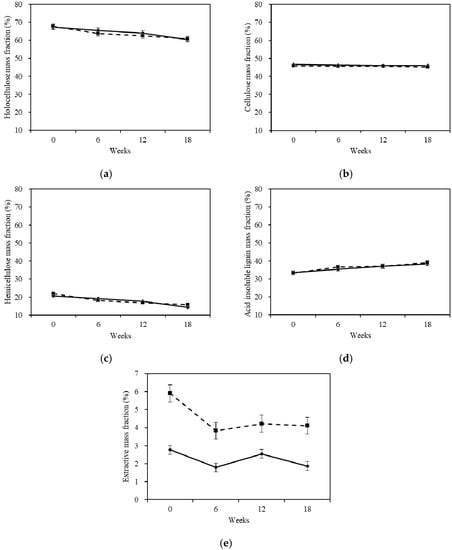 The change in hemicellulose mass fraction was similar to the total carbohydrates, as shown in Figure 4c. The hemicellulose mass fraction of sapwood and heartwood both had decreasing trends. The white-rot fungus steadily degraded the hemicellulose. The decline in hemicellulose mass fraction affected the integrity of the cell wall polymers and decreased the strength against mechanical loads [22]. The hemicellulose of sapwood and heartwood decreased by 30.8% and 28.0% during the whole cultivation period. During the first two stages, the white-rot fungus had a more evident effect on heartwood’s hemicellulose. The hemicellulose of heartwood had a higher percentage loss and degradation speed. In the last stage, the hemicellulose of sapwood had a higher percentage loss and degradation speed.