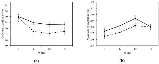 Changes of (a) cellulose crystallinity and (b) crystalline mean size before and after degradation. The continuous and discontinuous lines in the figure caption indicates sapwood and heartwood. The error bar is according to a confidence interval of 95%.