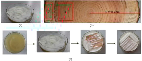 The white-rot fungus was collected and purified at the Research Institute of Forest Ecology Environment and Protection, Chinese Academy of Forestry (CAF). The white-rot fungus used in this study was directly bought from CAF. Fungal pure cultures were held on the potato dextrose agar (PDA) in Petri dishes in accordance with Huang [16] (Figure 6a). Wood disks were cut from two 37-year-old Chinese firs (Cunninghamia lanceolata (Lamb.) Hook.) at breast height. The diameter of the disk was 28.6 cm. The thickness of the disks was 10 cm–15 cm, as shown in Figure 6b. The sapwood and heartwood were distinguished by their color. The areas A and B in Figure 6b show the sapwood and heartwood used in this study, respectively. The disks were air-dried to 23 ± 2% moisture content and then divided into sapwood and heartwood. Specimens with a size of 50 mm × 10 mm × 5 mm (longitudinal × radial × tangential) were prepared for the following experiments. The treated sample preparation is shown in Figure 6c. The measured data was analyzed by the Statistic Package for Social Science (SPSS 19, IBM, Chicago, IL, USA) [30].