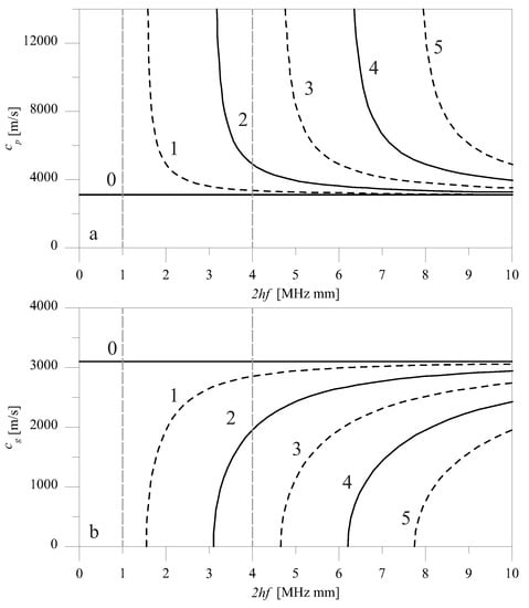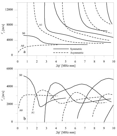 Phase (a) and group (b) velocity of Rayleigh–Lamb waves in an aluminum plate.
