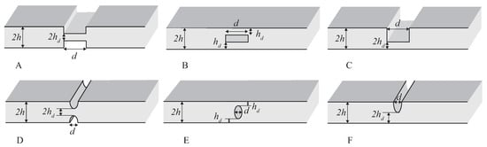 Profiles of discontinuities and voids under investigation: external symmetric (A,D); internal symmetric (B,E); external nonsymmetric (C,F).