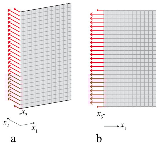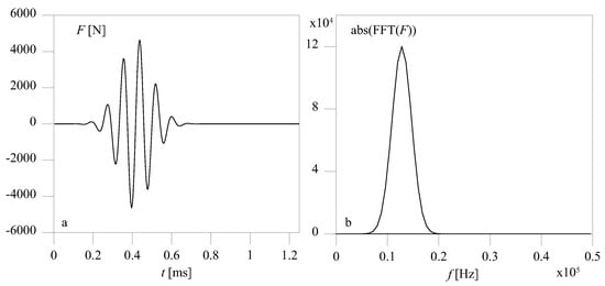 Two plane models were developed: a state of plane strain with in-plane displacements describing Rayleigh–Lamb waves, and an axisymmetric model with a very large radius and out-of-plane displacements, which describes shear waves. In fact, the shear solution tends to a torsional solution for large radii. The different kinds of waves investigated were generated by exciting one free end of the plate with a sine burst that we obtained as a sine wave modulated with a Gaussian window including around six periods. The time-history and Fourier transform of the forcing function are reported respectively in Figure 5a,b. The sine burst was used to select a narrow frequency band and reduce dispersion phenomena, and had an appropriate spatial distribution so that different incident waves could be modeled, as shown in Figure 6. This distribution of forces was merely a finite element strategy and is highly impracticable for laboratory tests. In practice, guided waves are generated with piezoelectric patches glued on the surface of the plate, whose strain time-history is electrically driven [26]. By using two in-phase transducers on the two surfaces of the plate, which apply displacements in the plane of the plate, an S0 wave can be easily generated. In an isotropic plate, the SH0 wave results as a by-product of this excitation at an angle of with respect to the direction of the displacement applied.