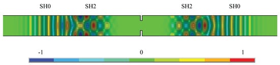 A qualitative description of the interaction between the SH0 mode and an A-type discontinuity (Figure 5) is provided in Figure 7, which reports the contour plot of displacements at a time instant after the SH0 wave had encountered the discontinuity. The case depicted in Figure 7 concerned a 2hf regime in which SH0, SH1 and SH2 waves could, in principle, propagate, and shows that the scattered response contained only the SH0 and SH2 modes. This result could be explained by observing that the contribution of nonsymmetric modes vanishes if the discontinuity is symmetric when one sets up the boundary conditions in the analytical form obtainable from the principle of reciprocity.