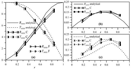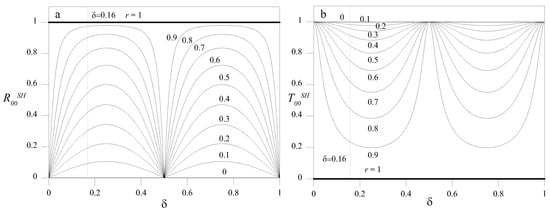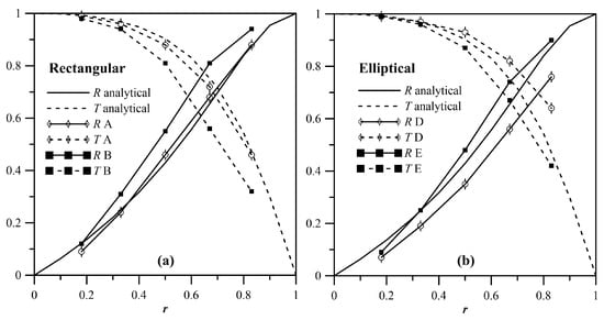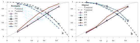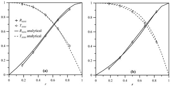 When the S0 mode interacted with a symmetric discontinuity, the reflection and transmission coefficients exhibited a dependence on that was similar to that obtained for shear waves, as reported in Figure 8. Figure 15 reports the reflection and transmission coefficients for a symmetric A-type discontinuity as a function of r for two different values of (a) and (b). The curves present a pattern analogous to that of the SH0 mode (see Figure 9), and show that there was a remarkable similarity between the analytical and FE model results.